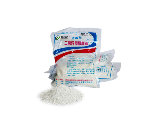外观:白色结晶粉剂、粒剂;规格:200g/袋*50袋/箱;有效氯含量:≥58%; PH值(1%水溶液):5.0~7.0; 保质期:2年;